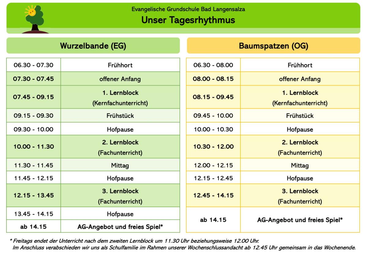 Für ein erfolgreiches Arbeiten in einer Schule mit Ganztagsangeboten ist eine gelungene Rhythmisierung des Schulalltages elementar. Ein ausgeglichener Wechsel von Aktivitäts- und Ruhephasen, von Anspannung und Entspannung sowohl auf geistiger als auch körperlicher Ebene verhilft den Schülerinnen und Schülern zu einer tragfähigen Leistungsfähigkeit. Neben einer sinnvollen zeitlichen Abfolge der Unterrichtsfächer, freier Zeiten und sonstiger Angebote berücksichtigen wir deshalb auch eine möglichst gleichmäßige Verteilung von besonders kognitiv ausgerichteten Fächern mit Fächern wie Sport, Kunst und Musik über die gesamte Schulwoche hinweg.
